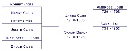 Generation #2 (1) James Cobb b. 1770, Halifax County, Virginia m. 23 Oct 1790, Lincoln County, North Carolina d. 1805, Lincoln County, North Carolina Sarah Beach b. >1770, Lincoln County, North Carolina d. >1823, Lincoln County, North Carolina children: 1. Robert Cobb b. 1790..1800, Lincoln County, North Carolina 2. Nancy Cobb b. ~1793 3. Henry Cobb b. ~1793, Lincoln County, North Carolina 4. Judith Cobb, b. ~1794 5. Charlotte Hetty Cobb, b. ~1795 6. Enoch Cobb, b. ~1796 (2) William West m. ~1823 Sarah [Beach] Cobb